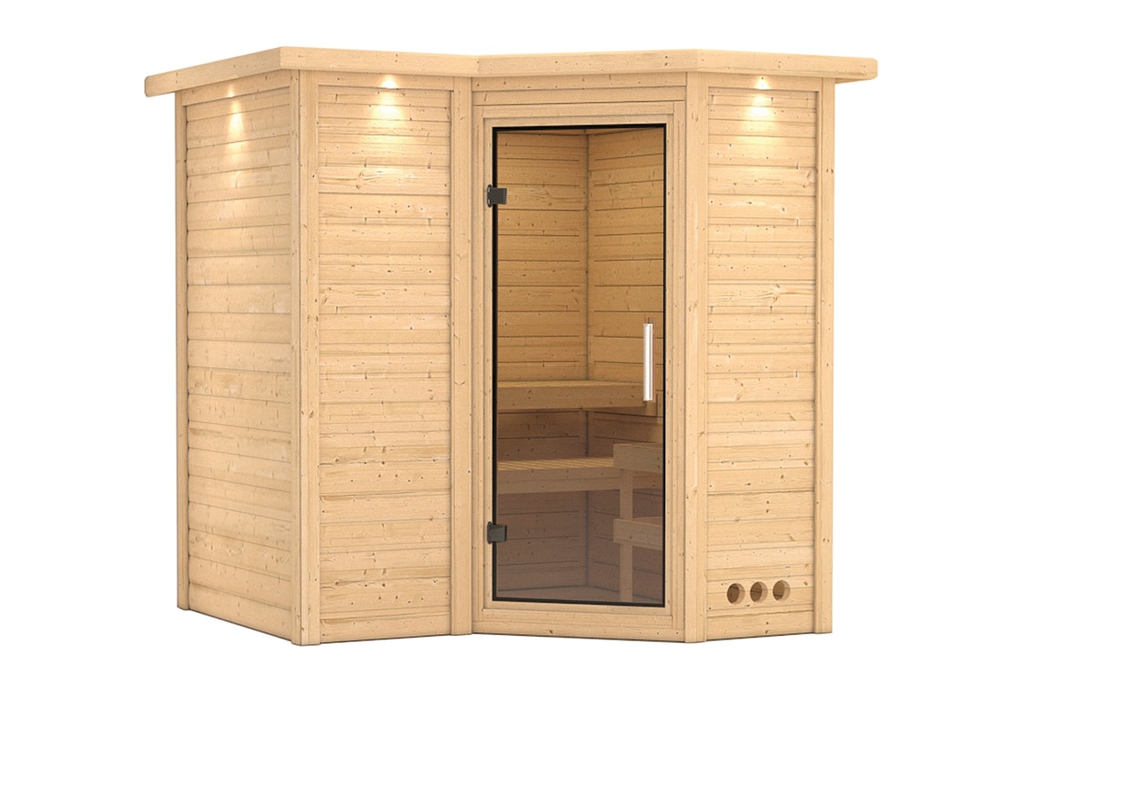 aribu Sauna Sahib 1-Massivholzsauna 40mm-Fronteinstieg -Exklusivoptik inkl. Saunatür, Ofenschutzgitter, Kopfstütze und Espenholzbänken. Lieferung je nach Wunsch ohne Ofen oder mit einem 9 kW (integrierte Steuerung), 9 kW (externe Steuerung) oder 9 kW Bio-Kombiofen (externe Steuerung) möglich.