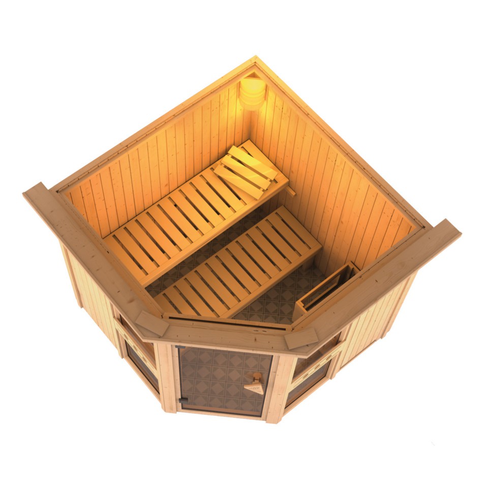 Die Karibu Sauna Amelia 1 eignet sich ideal für die Aufstellung in einer Ecke.