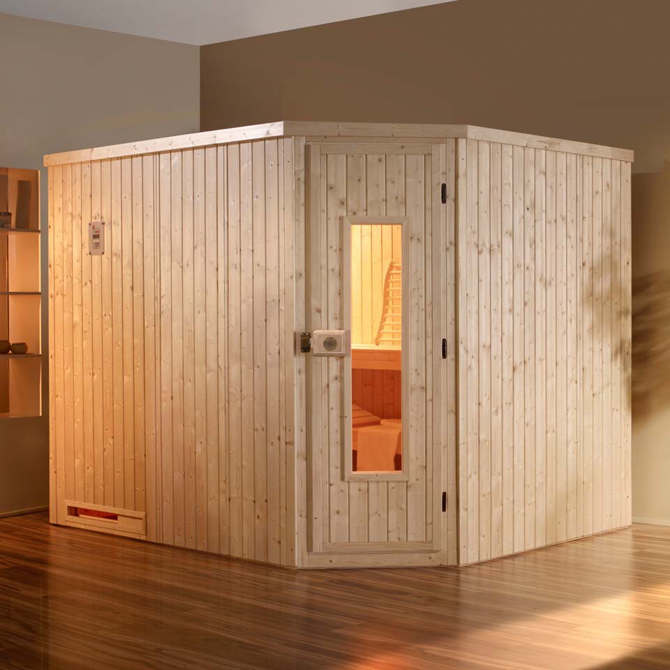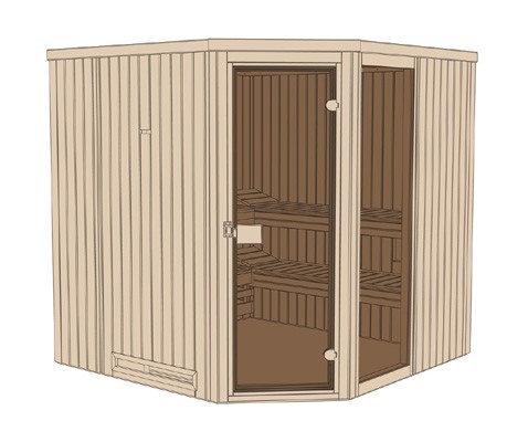 Elementsauna mit Eckeinstieg. Lieferung auf Wunsch ohne Ofen, mit einem 8 kW Ofen (integrierte Steuerung), 7,5 kW Ofen oder einem 7,5 kW BioAktiv-Ofen ( mit Steuergerät).