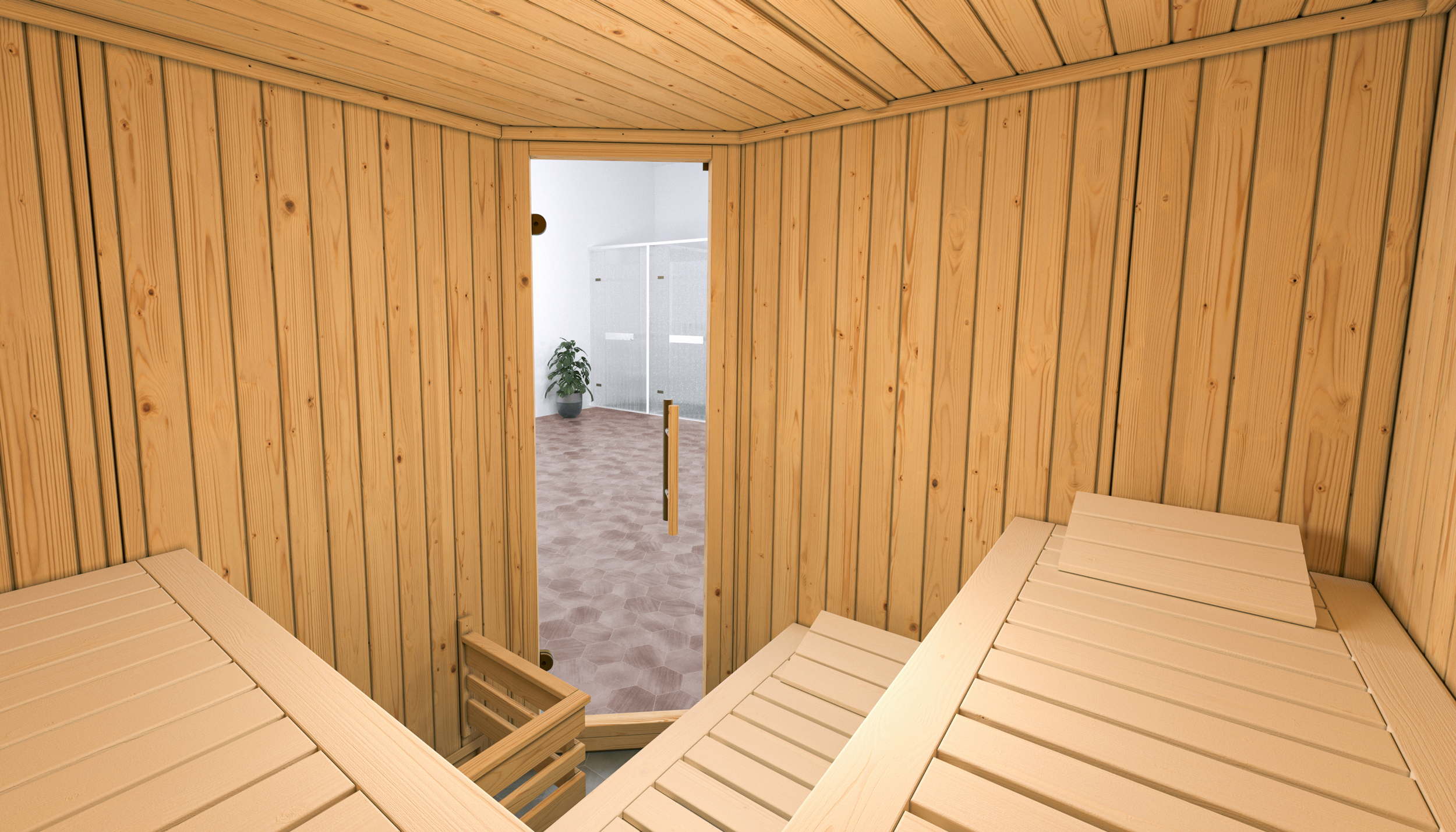Weka Elementsauna Varberg 3 Trend Familiensauna mit Eckeinstieg & weiß lasierten Fronten. Eine Wellnessoase im eigenen Heim? Die Weka Elementsauna Varberg 3 Trend mit platzsparendem Eckeinstieg macht dies möglich. Die Ganzglastür in Graphit-Optik besticht neben dem praktischen 2-Punkt-Magnetverschluss durch ihre edle und hochwertige Optik. Die Sauna ist