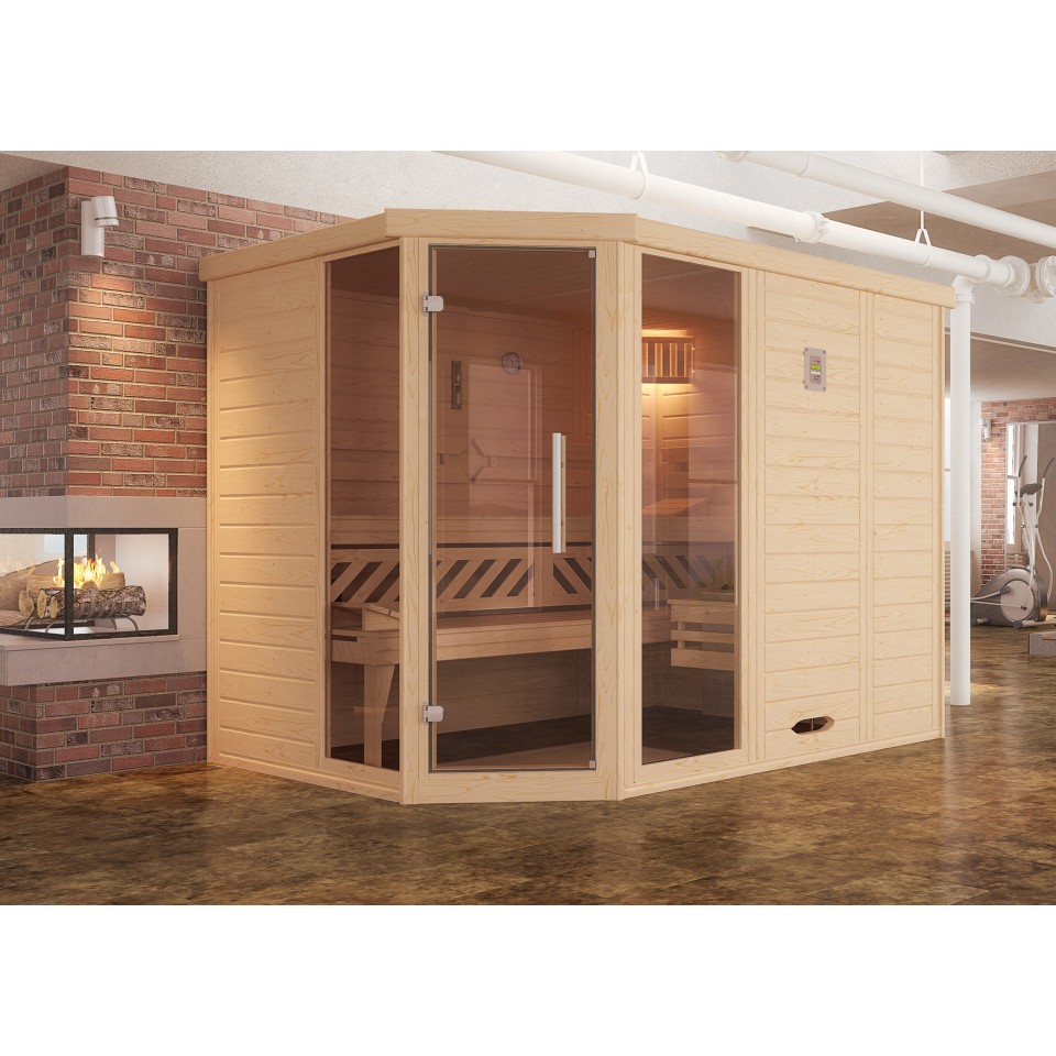 Weka Premium Massivholz-Elementsauna Kemi Eck 2 mit Glastür und 2 Fenster . Die 45 mm Premium Saunen sind aus