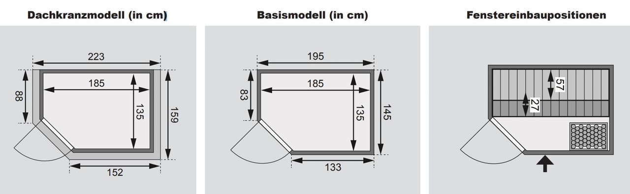 Maße: B 223 × T 159 × H 191 cm (inkl. Dachkranz),