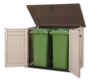 Die vielseitige Aufbewahrungsbox in Holzoptik für jeden Garten. Ideal um 2 Abfalltonnen bis