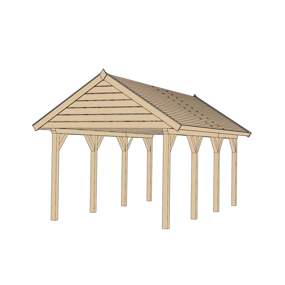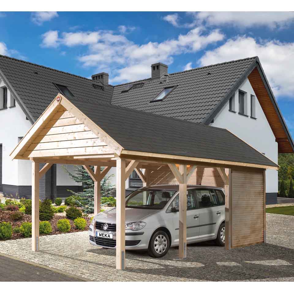 Das Weka Leimholz Satteldachcarport 614 in 2 Grössen kommt mit 19 mm Massivholz-Satteldach