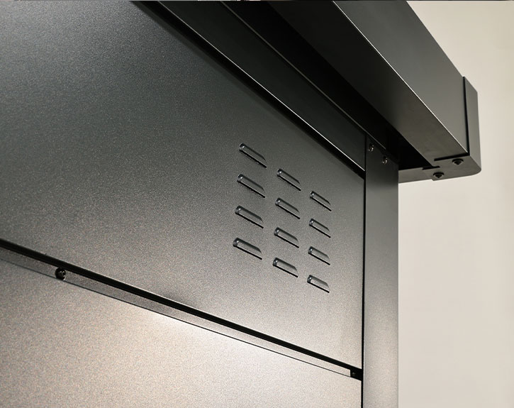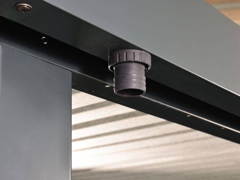 Die Wände des Metallhauses bestehen aus korrosionsbeständigem Stahlblech. Dieses Blech wurde zuerst feuerverzinkt und anschließend mit einer hochwertigen Pulverbeschichtung außen und auch innen in der Farbe Anthrazit veredelt. Für einen sicheren Stand sorgt der umlaufende Bodenrahmen, der mit den mitgelieferten Fundamenthaltern fest im Bodenreich verankert wird. Das Stahlblech des Daches ist bereits so geformt, dass Wasser leicht abfließen, in der Regenrinne aufgefangen und mithilfe der beiden Fallrohre zielgerichtet abgeleitet werden kann. Unter dem Dach schützt ein Anti Tropf-Vlies effektiv vor Kondenswasserbildung. Die beiden gegenüberliegenden Lüftungsgitter sorgen für guten Luftaustausch und helfen zusätzlich, Feuchtigkeit und Schimmelbildung zu vermeiden. Die stabile Dachkonstruktion in Kombination mit dem robusten Bodenrahmen und den hochwertigen Wänden machen dieses Haus zu einem echten Kraftpaket. Es hält Dachlasten aus bis 150 kg/m² und trotzt Windlasten bis Windstärke 12.