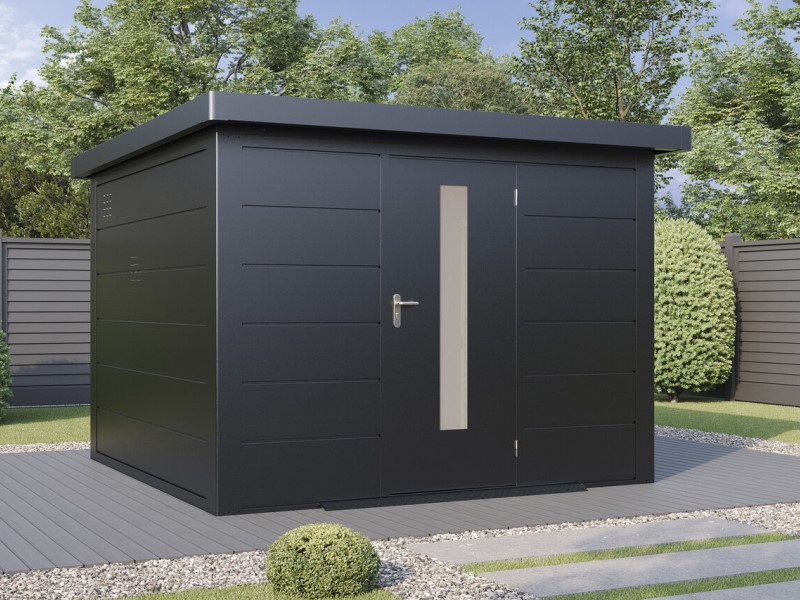 Du suchst ein geräumiges Gartenhaus für Deine Gartenutensilien? Es soll absolut wartungs- und pflegefrei sein? Du möchtest ein langlebiges, qualitativ absolut hochwertiges Gartenhaus haben? Dann bist Du hier richtig. Das Gartenhaus Hakon von Finnhaus Wolff lässt keine Wünsche offen. Dieses Metallhaus beeindruckt auf den ersten Blick durch seine ästhetische Optik und auf den zweiten durch die vielen durchdachten Details. Die Tür mit Gasdruckfeder, die integrierten Lüftungsgitter, das Dachentwässerungssystem, die hohe Schnee- und Windlast und die extreme Raumhöhe von 230 cm, die es nur bei Finnhaus Wolff gibt, sind nur einige Merkmale, die sich von herkömmlichen Metallhäusern unterscheiden. Metall Gartenhaus Hakon 3030 - durchdacht bis ins kleinste Detail Die Wände des Metallhauses bestehen aus korrosionsbeständigem Stahlblech. Dieses Blech wurde zuerst feuerverzinkt und anschließend mit einer hochwertigen Pulverbeschichtung außen und auch innen in der Farbe Anthrazit veredelt. Für einen sicheren Stand sorgt der umlaufende Bodenrahmen, der mit den mitgelieferten Fundamenthaltern fest im Bodenreich verankert wird. Das Stahlblech des Daches ist bereits so geformt, dass Wasser leicht abfließen, in der Regenrinne aufgefangen und mithilfe der beiden Fallrohre zielgerichtet abgeleitet werden kann. Unter dem Dach schützt ein Anti Tropf-Vlies effektiv vor Kondenswasserbildung. Die beiden gegenüberliegenden Lüftungsgitter sorgen für guten Luftaustausch und helfen zusätzlich, Feuchtigkeit und Schimmelbildung zu vermeiden. Die stabile Dachkonstruktion in Kombination mit dem robusten Bodenrahmen und den hochwertigen Wänden machen dieses Haus zu einem echten Kraftpaket. Es hält Dachlasten aus bis 150 kg/m² und trotzt Windlasten bis Windstärke 12. Für eine komfortable Nutzung ist dieses Metallhaus mit einer breiten, verzugsfreien Tür ausgestattet, die sich dank der praktischen Gasdruckfeder leicht öffnen und schließen lässt. Die Drückergarnitur ist aus Edelstahl und mit dem hochwertigen Zylinderschloss kann dieses Gartenhaus auch bei Bedarf abgeschlossen werden. Der Lichtausschnitt in der Tür aus Echtglas verleiht dem Gartenhaus nicht nur eine gewisse Eleganz, sondern lässt auch noch wertvolles Tageslicht ins Innere. Die Einzeltür hat eine enorme Durchgangshöhe von 202 cm, was Dir ein bequemes Ein- und Ausräumen auch von langen, unhandlichen Gerätschaften ermöglicht. Mit der beeindruckenden Firsthöhe von 231 cm bietet Dir dieses Gartenhaus eine sehr effektive Raumnutzung. Die verwendeten Materialien bei diesem Metallhaus sind so hochwertig und die Verarbeitung so professionell, dass Du vom Hersteller eine Garantie von 25 Jahren gegen Durchrostung erhältst. Allgemein