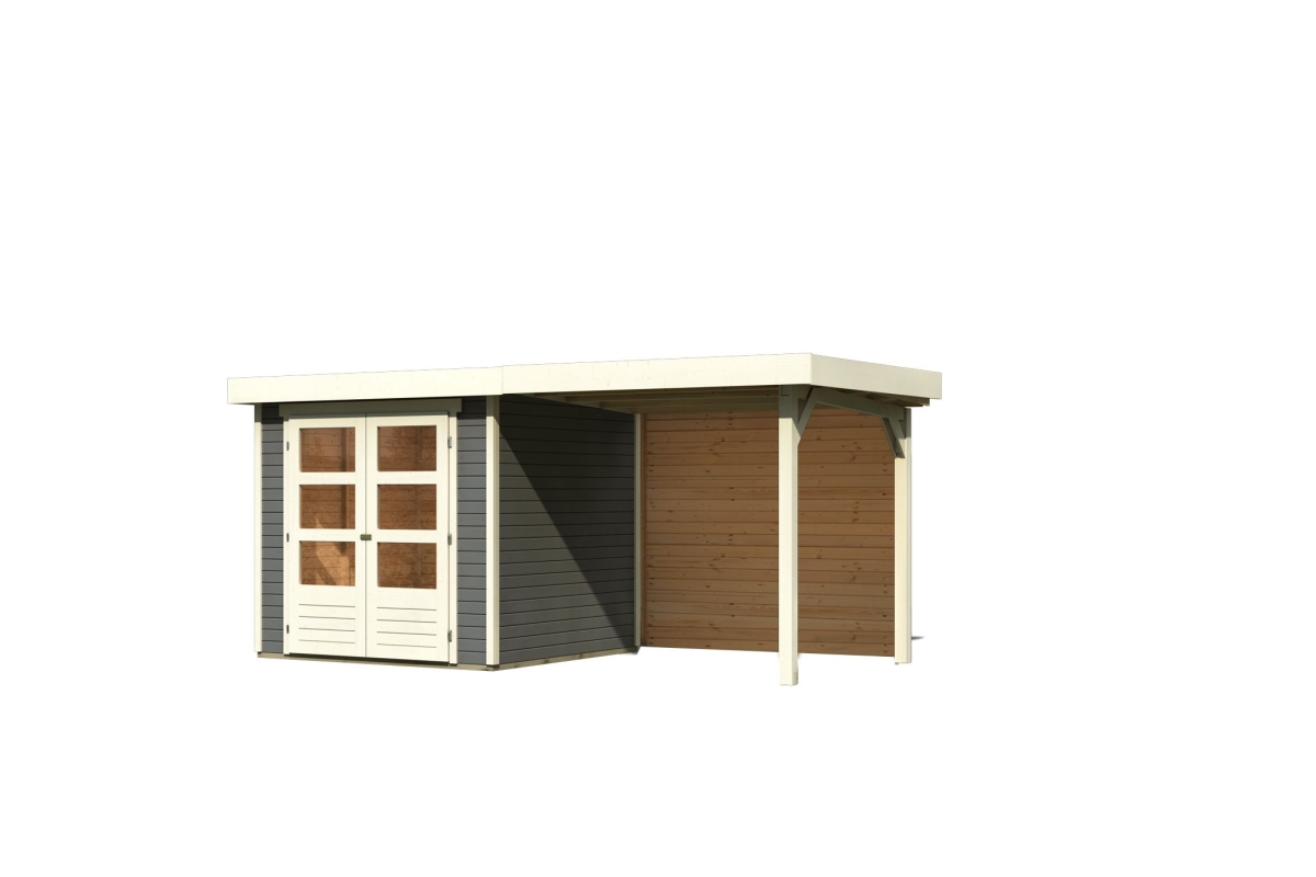 Gartenhaus Askola 2 - der Akzent in Ihrem Garten. Das 19mm Systemhaus aus nordischer Fichte im einfachen Steck- und Schraubsystem ist in den Farben seidengrau, sandbeige, terragrau und in naturbelassen erhältlich. Egal ob modern, klassisch oder elegant, das Gartenhaus Askola passt in jedes Gartenambiente. Mit einem Außenmaß von (BxT) 213x217cm hat es die ideale Größe zum Verstauen von Gartengeräten oder zum Gestalten eines gemütlichen Rückzugsortes im eigenen Garten. Das Haus ist ebenfalls mit einem Anbaudach in den Breiten 2,40m oder 2,80m erhältlich. Dieses dient optimal als Unterstand für Gartengeräte oder für eine bequeme Sitzgruppe für Grillabende. Geschütztes Grillen an einem verregneten Sommertag steht nun nichts mehr im Wege. Das Innere des Gartenhauses wird durch eine Sicherheitsüberfalle vor unbefugtem Eindringen geschützt. Die großzügige Doppelflügeltür mit drei Lichtausschnitten pro Türflügel sorgt für viel Lichteinfall, sodass das Haus nicht nur von außen strahlen kann. Durch seine moderne Optik wird das Gartenhaus Askola zu einem echten Hingucker in Ihrem Garten. Setzen Sie einen Akzent in Ihrem Garten mit dem Askola 2.