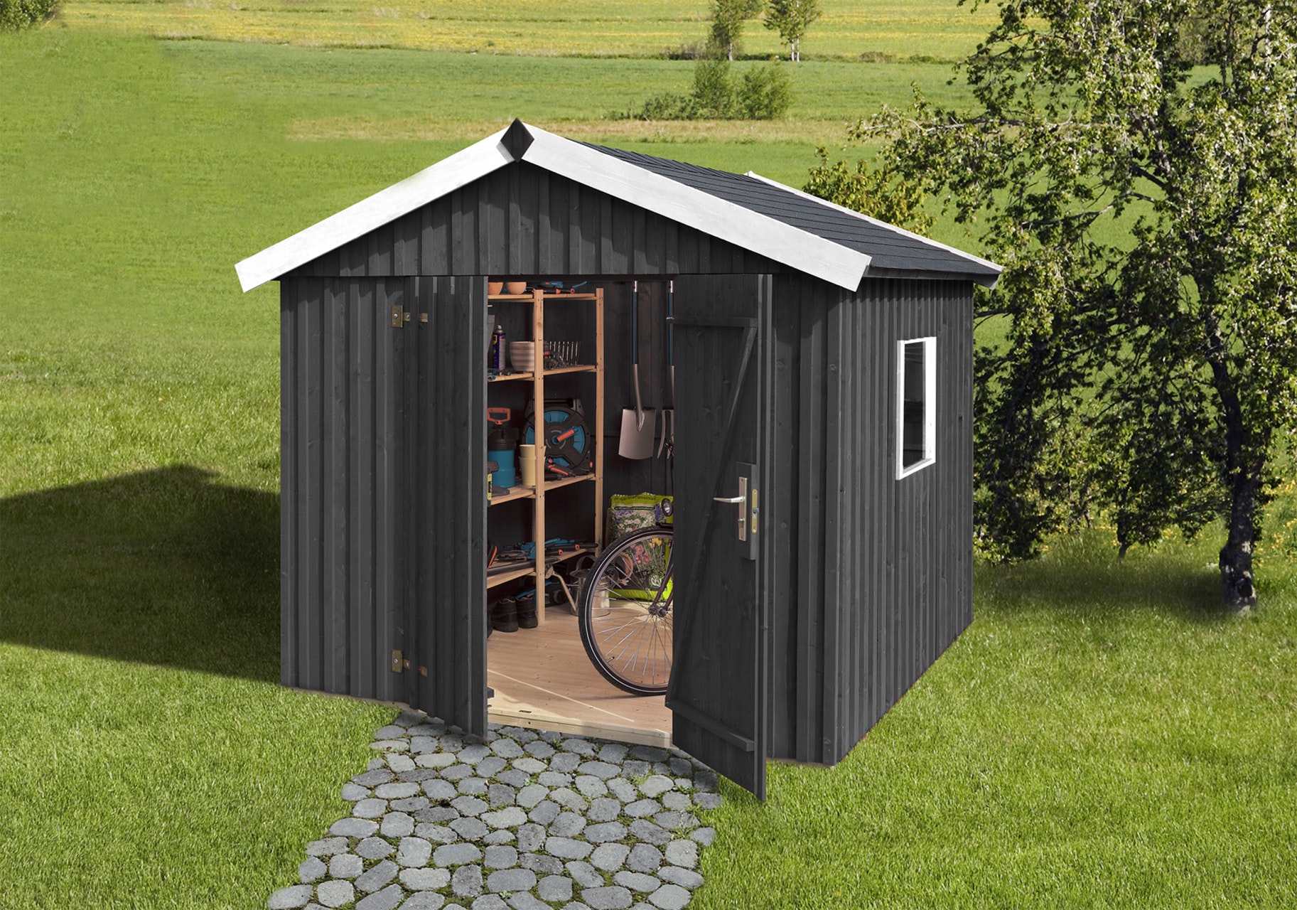 genügend Stauraum für Fahrräder oder Gartenutensilien. Das Gartenhaus ist 162 cm breit und 168 cm tief.
