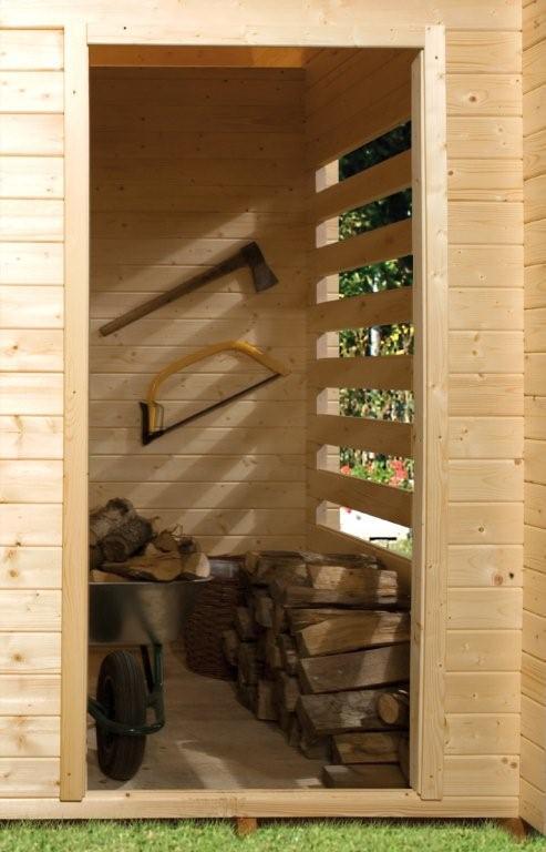 daneben ein abschließbarer Geräteraum und ein gut durchlüfteter Holzlagerplatz für das Kaminholz.