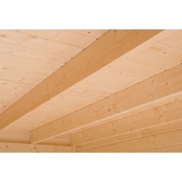 Das Dach dieses 45 mm Blockbohlenhauses besteht aus einer 19 mm starken Dachschalung mit professionellem Dachrandabschlussprofil aus Aluminium. Durch diese Dachkonstruktion ist auch das Dach sehr leicht und schnell zu montieren.