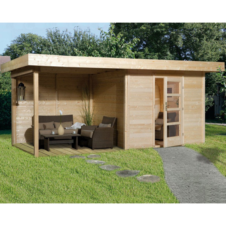 Modernes Weka 28 mm Blockbohlenhaus Lounge 3 mit seitlichem Anbau (300 cm) inkl. Stützen, Abschlussblende und Rückwand sowie attraktiver Panorama-Einzeltür