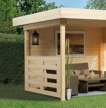 Modernes Weka 28 mm Blockbohlenhaus mit attraktiven 19 mm Pultdach inkl. 50 cm Vordach und attraktiver Doppelflügel-Panoramatür