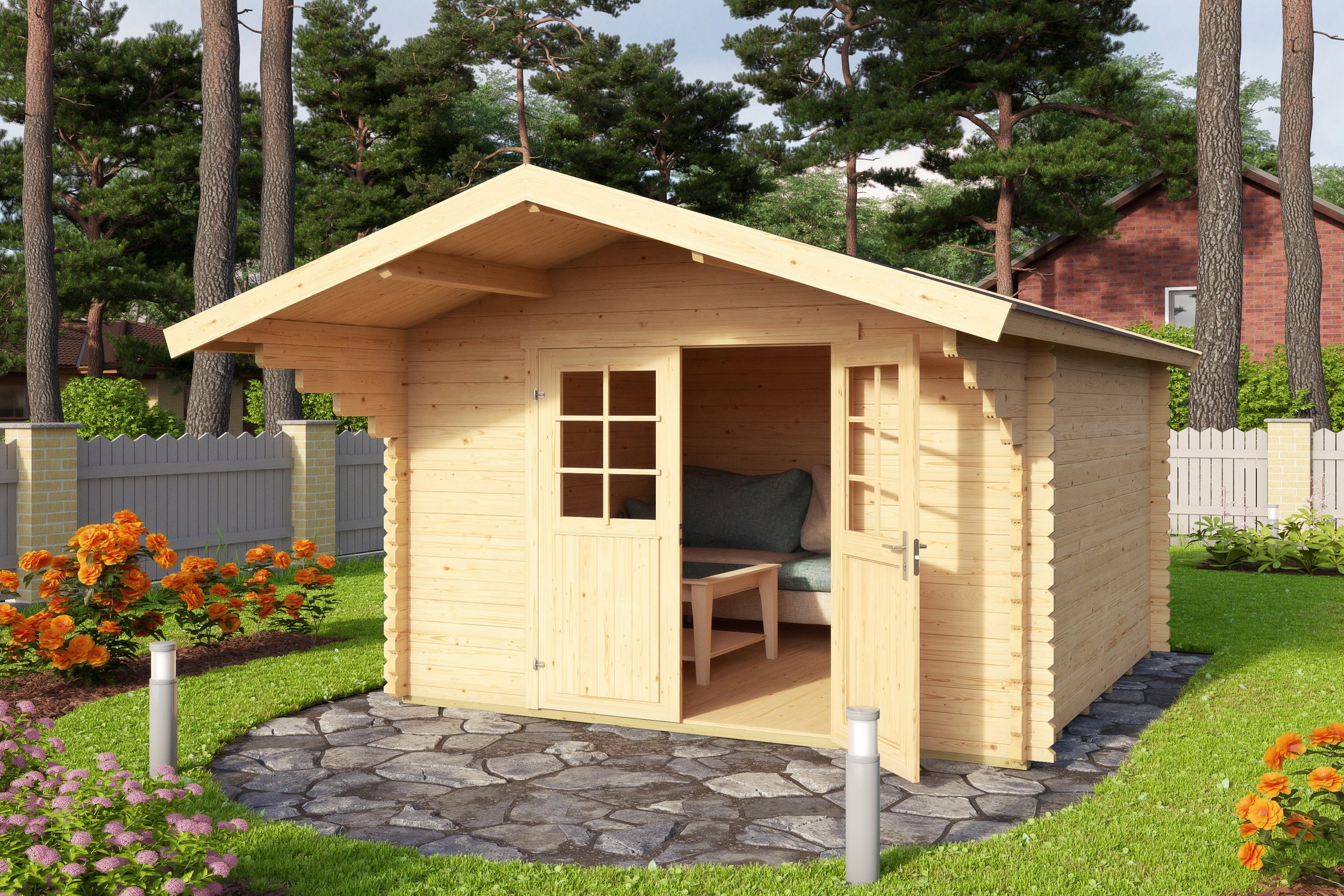 28mm Gartenhaus Holz mit Satteldach, 3x3m unbehandelter Bausatz, 28mm Wandstärke, Doppeltür, Echtverglasung,