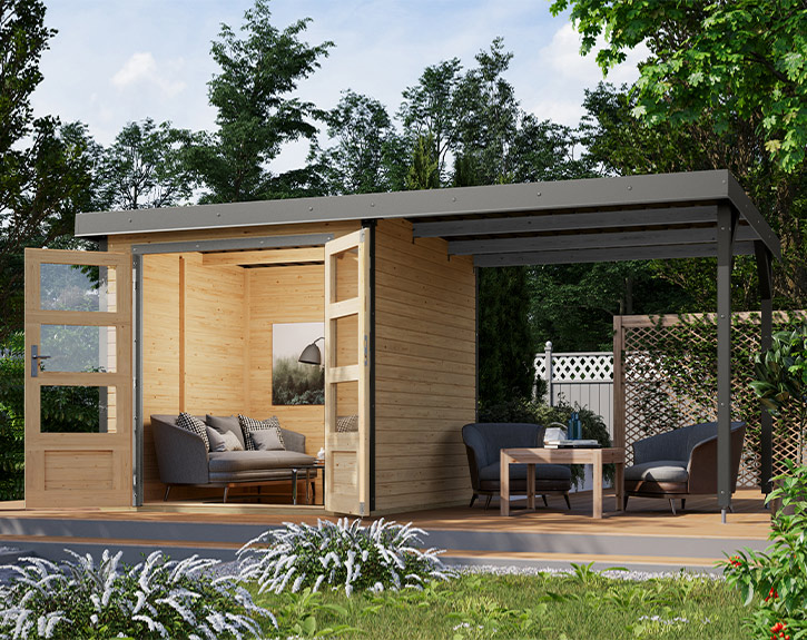 Karibu Hybrid-Gartenhaus Jupiter 2 A + 2,4m Anbaudach - 19mm Elementhaus - Geräteschuppen - Pultdach - natur/grau