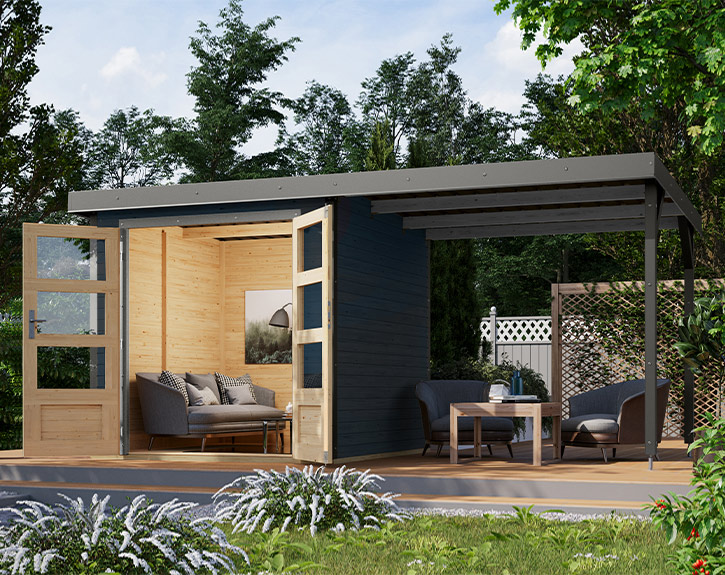 Mit diesem Hybrid-Gartenhaus bietet Karibu Dir ein echtes Premium-Produkt, welches die Vorteile von Holz und Metall zu einem Holz-Gartenhaus mit minimalem Wartungsaufwand vereint. Diese Mischung aus warmem Holz und robustem Metall sorgt für erhöhte Langlebigkeit, zusätzliche Stabilität und verstärkten Schutz vor den Witterungseinflüssen. Dieses Gartenhaus ist bereits von außen werksseitig mit einer Lasur in der Farbe Anthrazit gestrichen. In Kombination mit den Metallteilen in der Farbe Graualuminium und dem anthrazitfarbenen Dach aus Trapezblech erhältst Du ein extravagantes, modernes Gartenhaus. Das praktische Anbaudach bietet weiteren Abstellplatz für Grill, Fahrrad und Co, ist aber auch perfekt für eine chillige Sitzecke geeignet. Allgemein