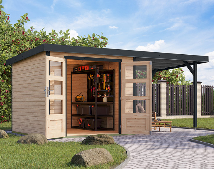 Karibu Hybrid-Gartenhaus Jupiter 3,5 A + 2,4m Anbaudach - 19mm Elementhaus - Geräteschuppen - Pultdach - natur/anthrazit