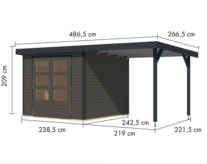 Karibu Hybrid-Gartenhaus Jupiter 3,5 B + 2,4m Anbaudach - 19mm Elementhaus - Geräteschuppen - Pultdach - terragrau/anthrazit