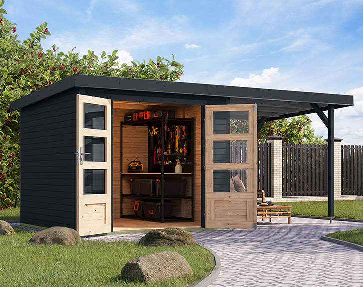 Karibu Hybrid-Gartenhaus Jupiter 3,5 C + 2,4m Anbaudach - 19mm Elementhaus - Geräteschuppen - Pultdach - anthrazit/anthrazit