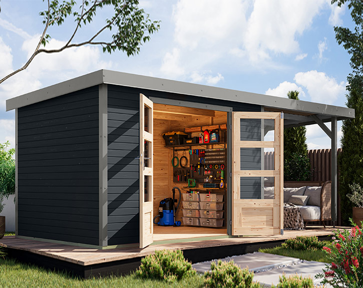 Mit diesem Hybrid-Gartenhaus bietet Karibu Dir ein echtes Premium-Produkt, welches die Vorteile von Holz und Metall zu einem Holz-Gartenhaus mit minimalem Wartungsaufwand vereint. Diese Mischung aus warmem Holz und robustem Metall sorgt für erhöhte Langlebigkeit, zusätzliche Stabilität und verstärkten Schutz vor den Witterungseinflüssen. Dieses Gartenhaus ist bereits von außen werksseitig mit einer Lasur in der Farbe Anthrazit gestrichen. In Kombination mit den Metallteilen in der Farbe Graualuminium und dem anthrazitfarbenen Dach aus Trapezblech erhältst Du ein extravagantes, modernes Gartenhaus. Das praktische Anbaudach bietet weiteren Abstellplatz für Grill, Fahrrad und Co, ist aber auch perfekt für eine chillige Sitzecke geeignet. Allgemein