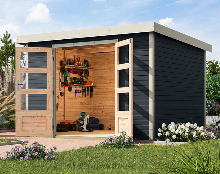 Mit diesem Hybrid-Gartenhaus bietet Karibu Dir ein echtes Premium-Produkt, welches die Vorteile von Holz und Metall zu einem Holz-Gartenhaus mit minimalem Wartungsaufwand vereint. Diese Mischung aus warmem Holz und robustem Metall sorgt für erhöhte Langlebigkeit, zusätzliche Stabilität und verstärkten Schutz vor den Witterungseinflüssen. Dieses Gartenhaus ist bereits von außen werksseitig mit einer Lasur in der Farbe Anthrazit gestrichen. In Kombination mit den Metallteilen in der Farbe Weiß und dem anthrazitfarbenen Dach aus Trapezblech erhältst Du ein extravagantes, modernes Gartenhaus. Allgemein