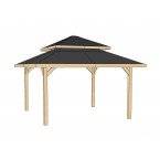 Die Konstruktion dieser Gartenlaube besteht aus 90 x 90 mm starken Massivholzpfosten bei Gr.1 und 120 x 120 mm starken Massivholzpfosten bei Gr.2. Stabile Dachpfetten und Längssparren sorgen für extra Sicherheit und Stabilität.