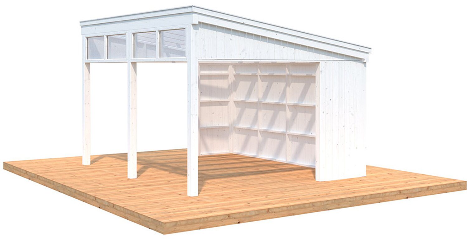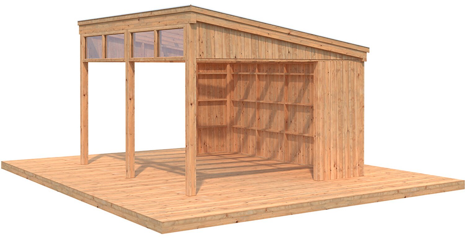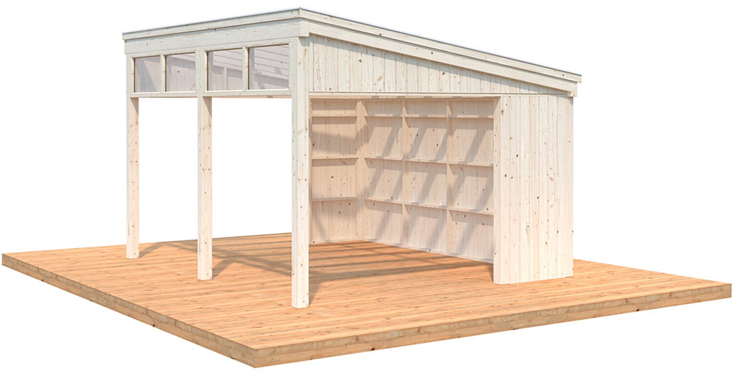 Palmako Holz-Pavillon Nova 13,0 m² Kit aus unbehandeltem nordischem Fichtenholz. Nach drei Seiten und oben offener Pavillon - das perfekte Sommerabend-Wohnzimmer in Ihrem Garten. Holzrahmen-Konstruktion mit der Möglichkeit eine 70 mm dicke Dämmschicht anzubringen. Holzfußboden, Schiebetürelemente, Terrassenboden und Dachbedeckung nicht im Lieferumfang enthalten. Gegen Aufpreis liefern wir Nova mit einer farblosen, braunen oder grauen Tauchgrundierung bzw. einer weißen Grundierung, die Ihnen die Weiterbehandlung erleichtert.