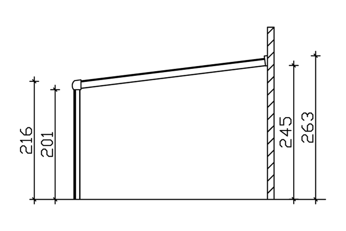 Eine Regenrinne ist bereits in der Pfette integriert. Der Ablauf kann wahlweise im Pfosten oder außen am Pfosten erfolgen. Der Wandanschluss ist bereits im Wandprofil integriert.